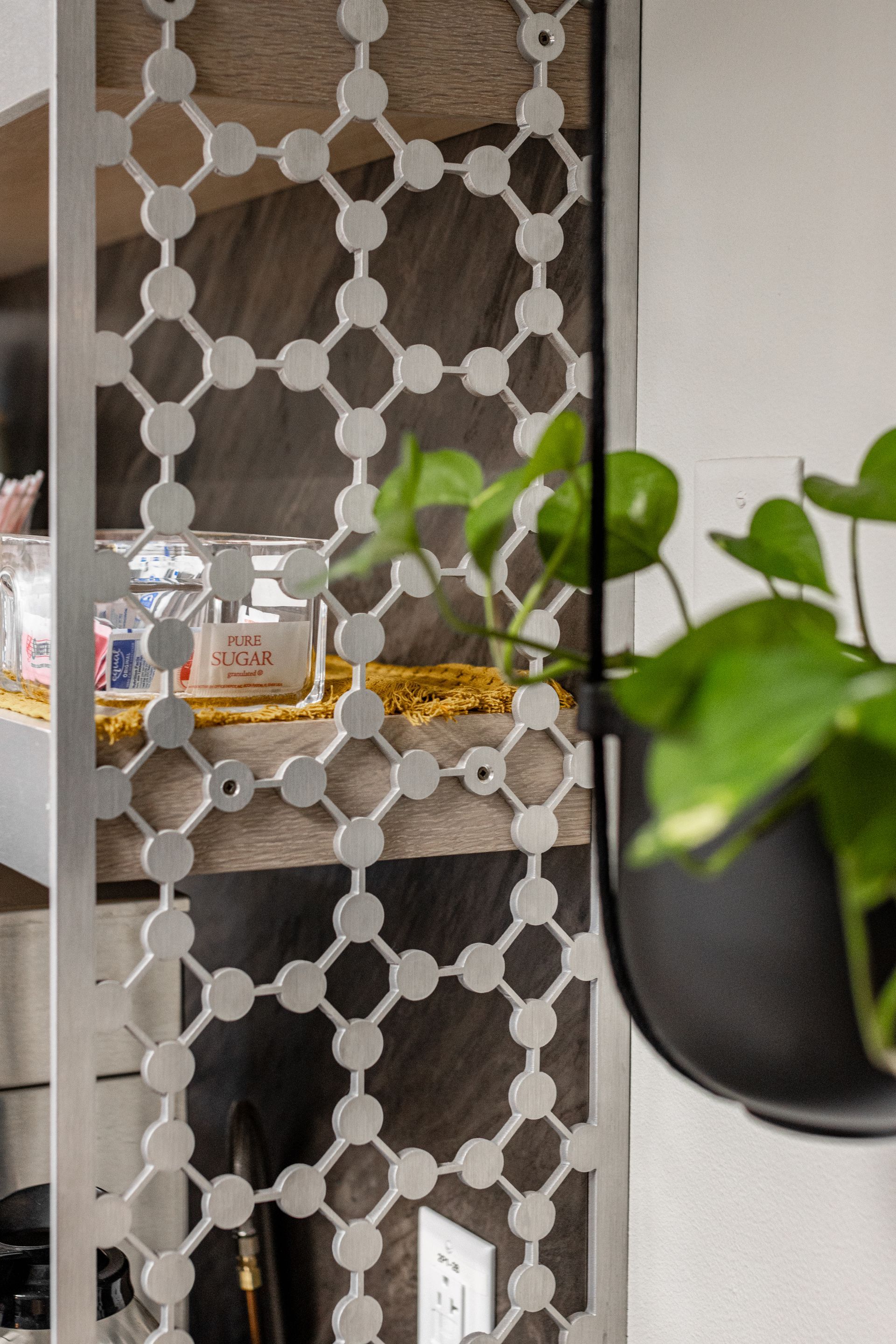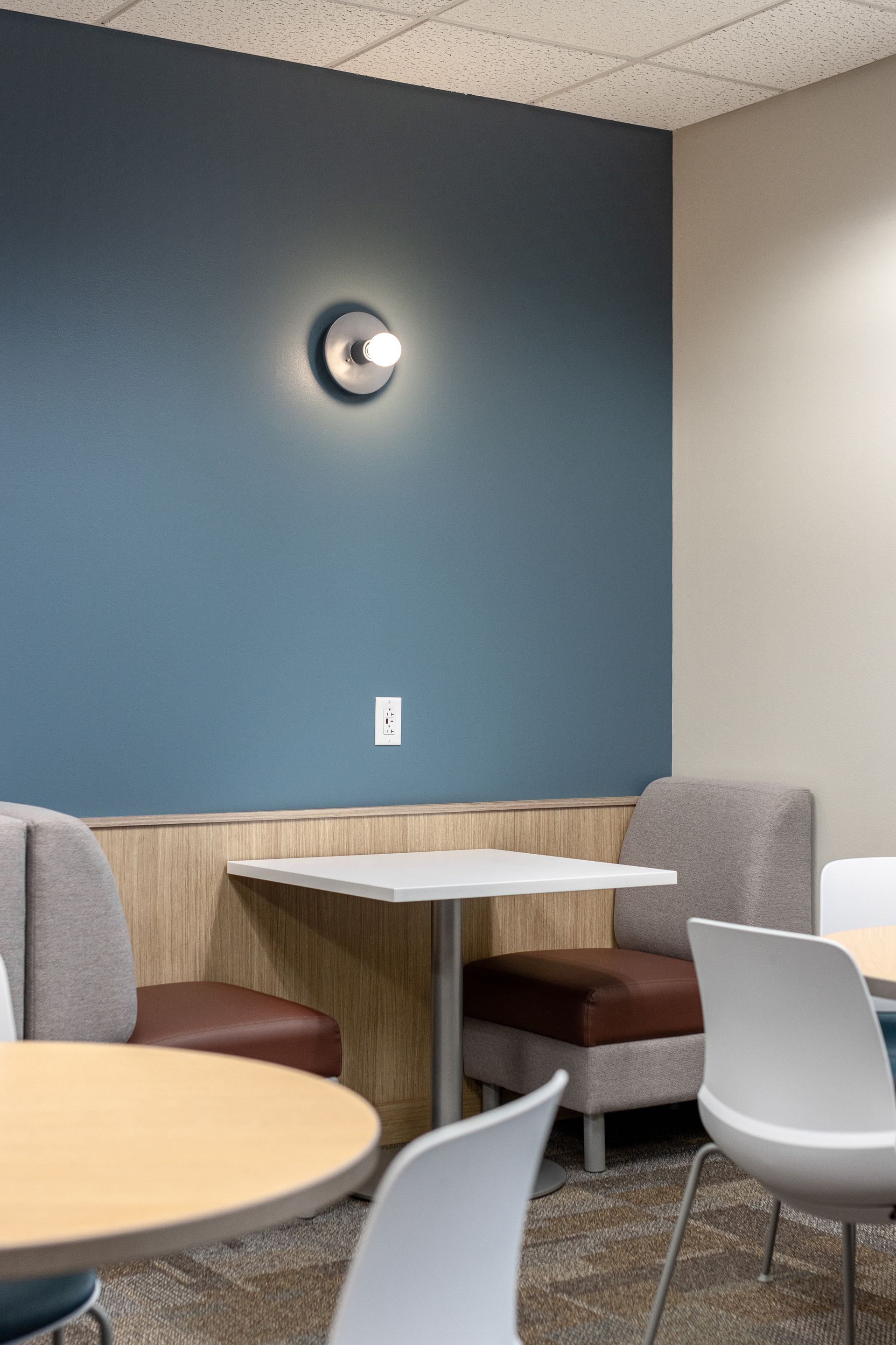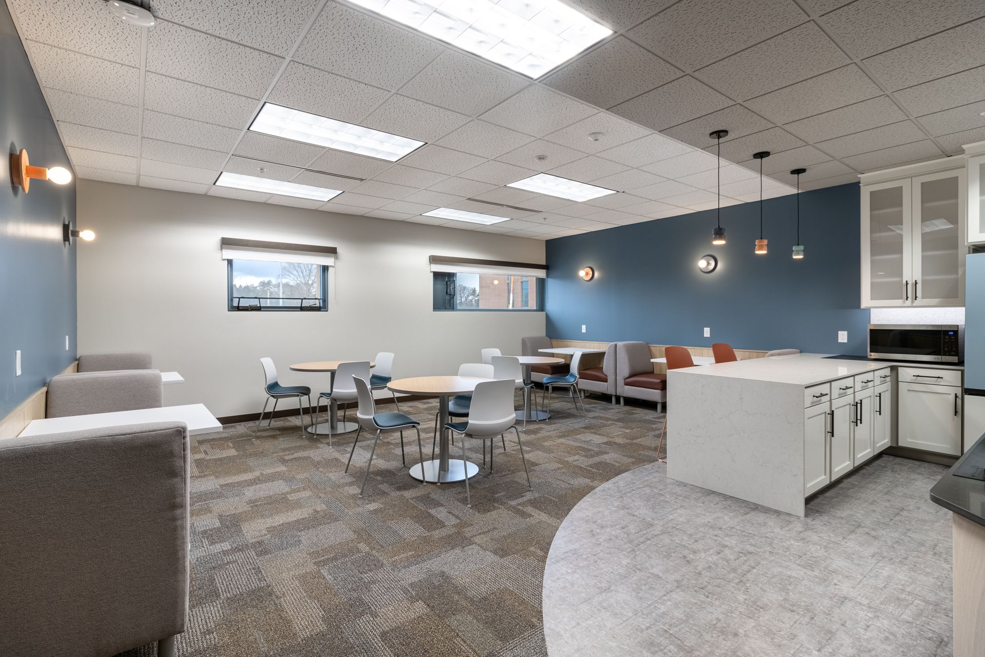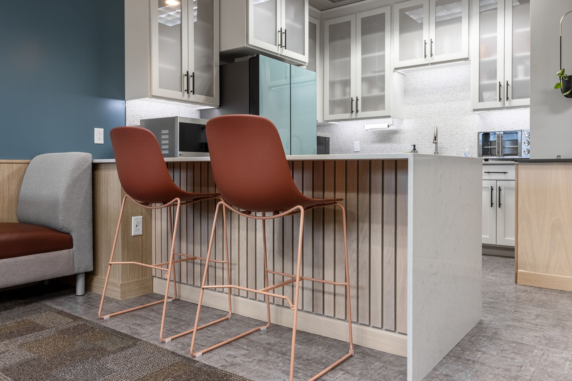 Penn State Earth and Engineering Sciences came to HLA with a desire to modernize their employee lounge on a budget. Last renovated in the early 2000s with an aesthetic that seemed to coincide more with the 80s era, their lounge completely lacked appeal resulting in underutilization. HLA was challenged with instituting a fresh and updated interior finish concept that not only complemented existing features of the space that were unable to be changed, but also incorporated elements symbolic of the department’s work in natural sciences. The finished product features a synchrony of various natural materials with a modern, playful color scheme, and with the added help of soft seating and expanded kitchen storage, the new and improved space is sure to provide staff with all the amenities that a lounge should. Can you spot the hidden carbon allotrope structure pattern?