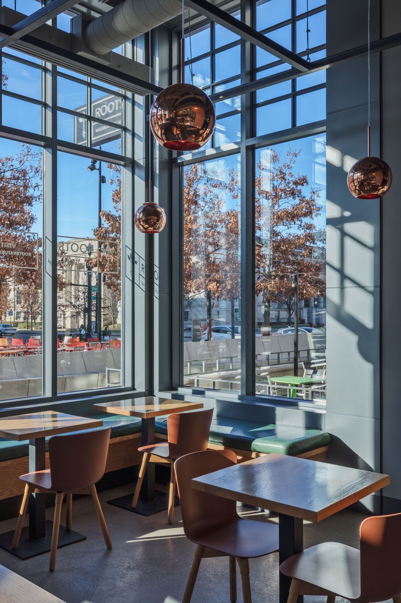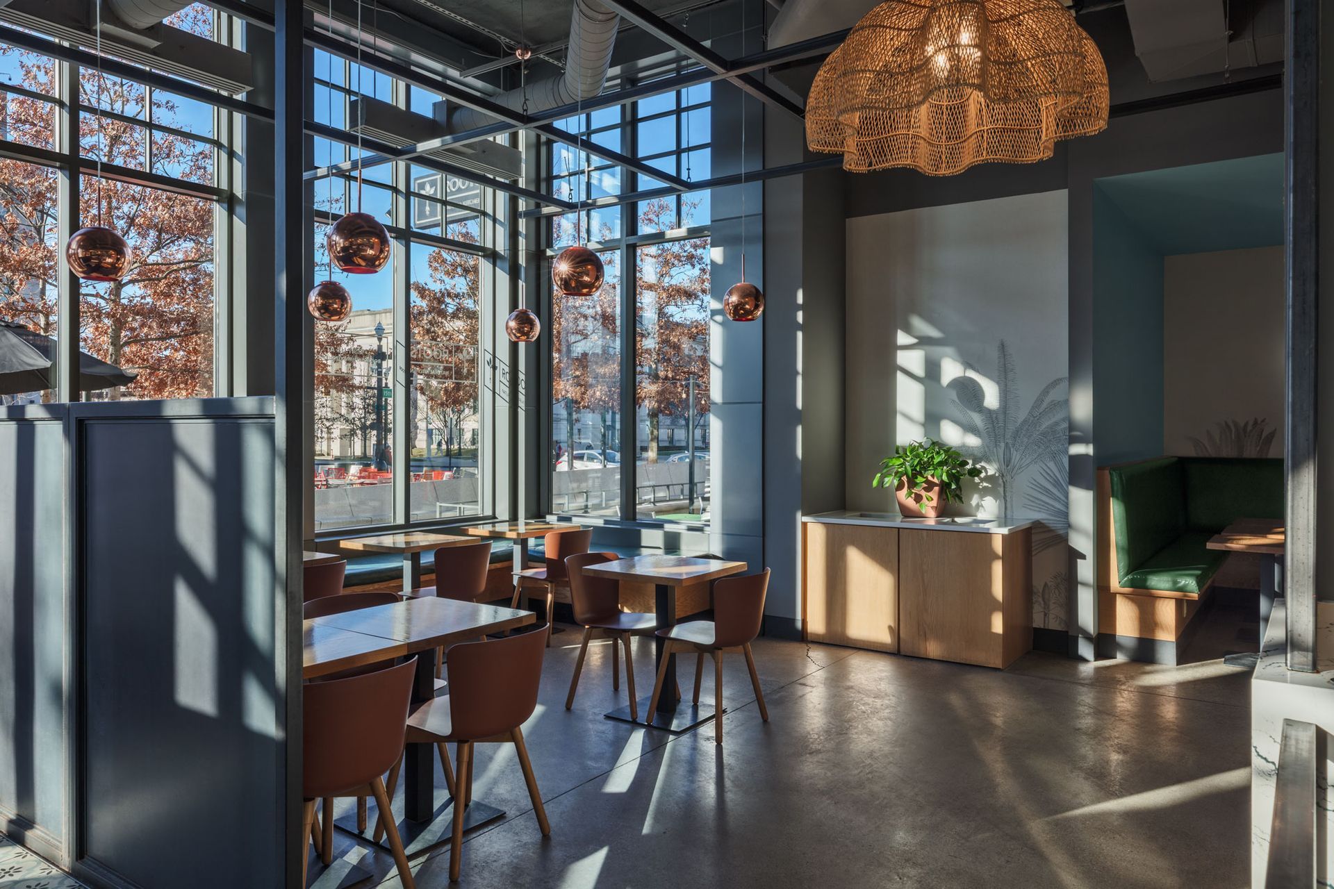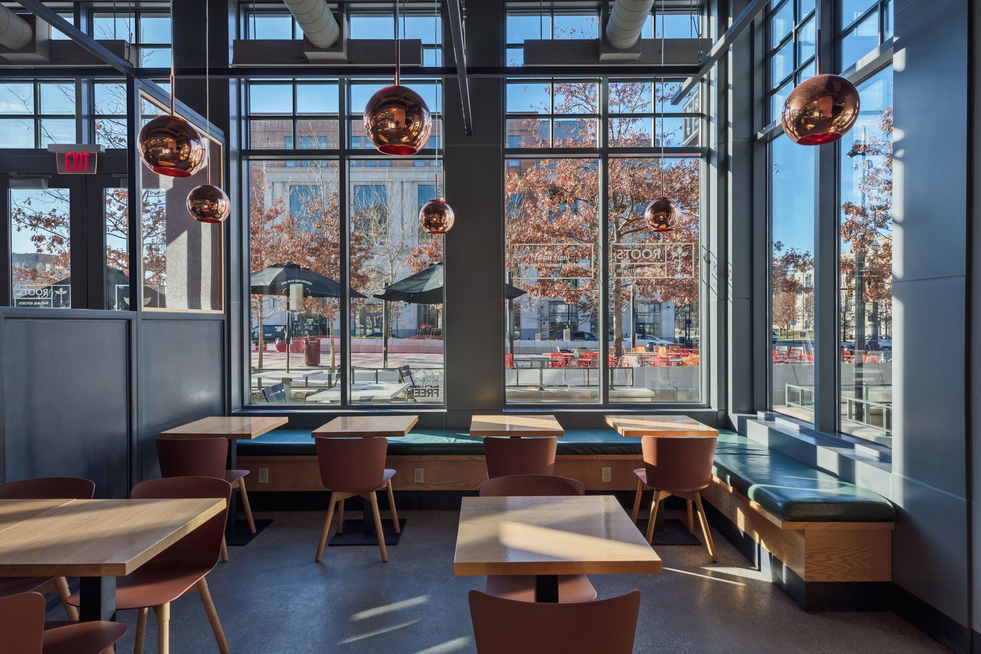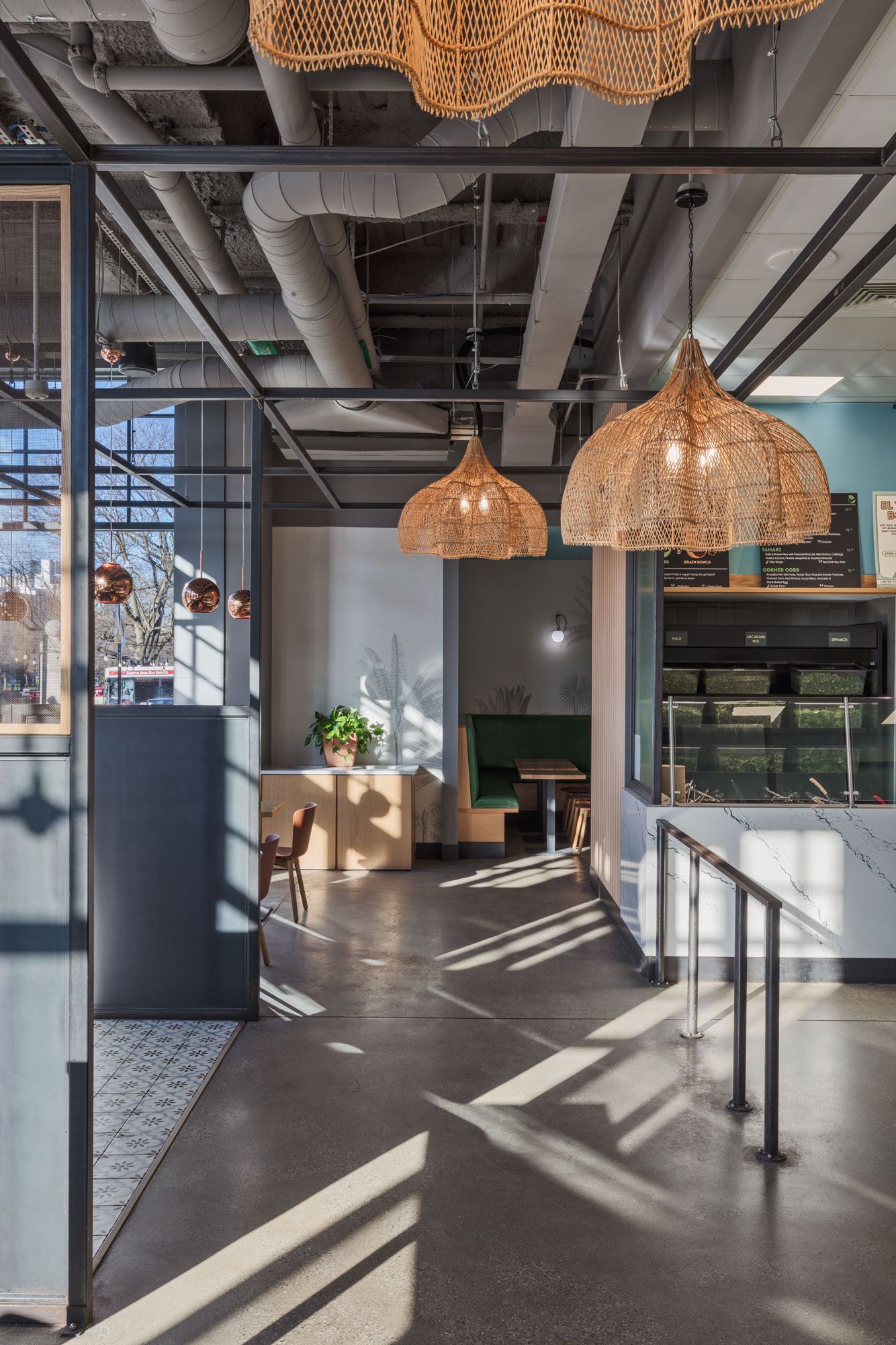 Roots Natural Kitchen interior with wooden tables, brown chairs, woven pendant lights, and floor-to-ceiling windows.