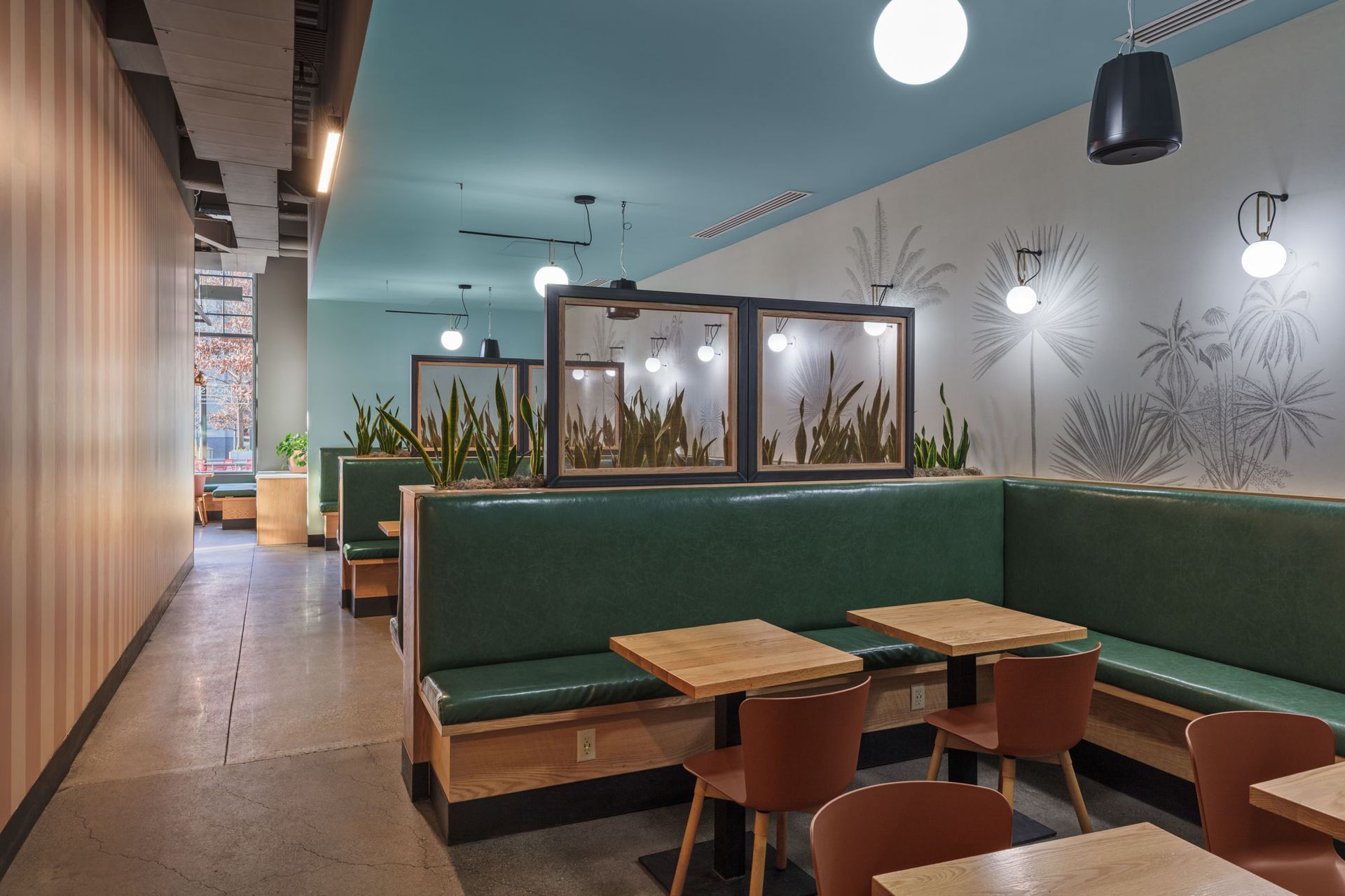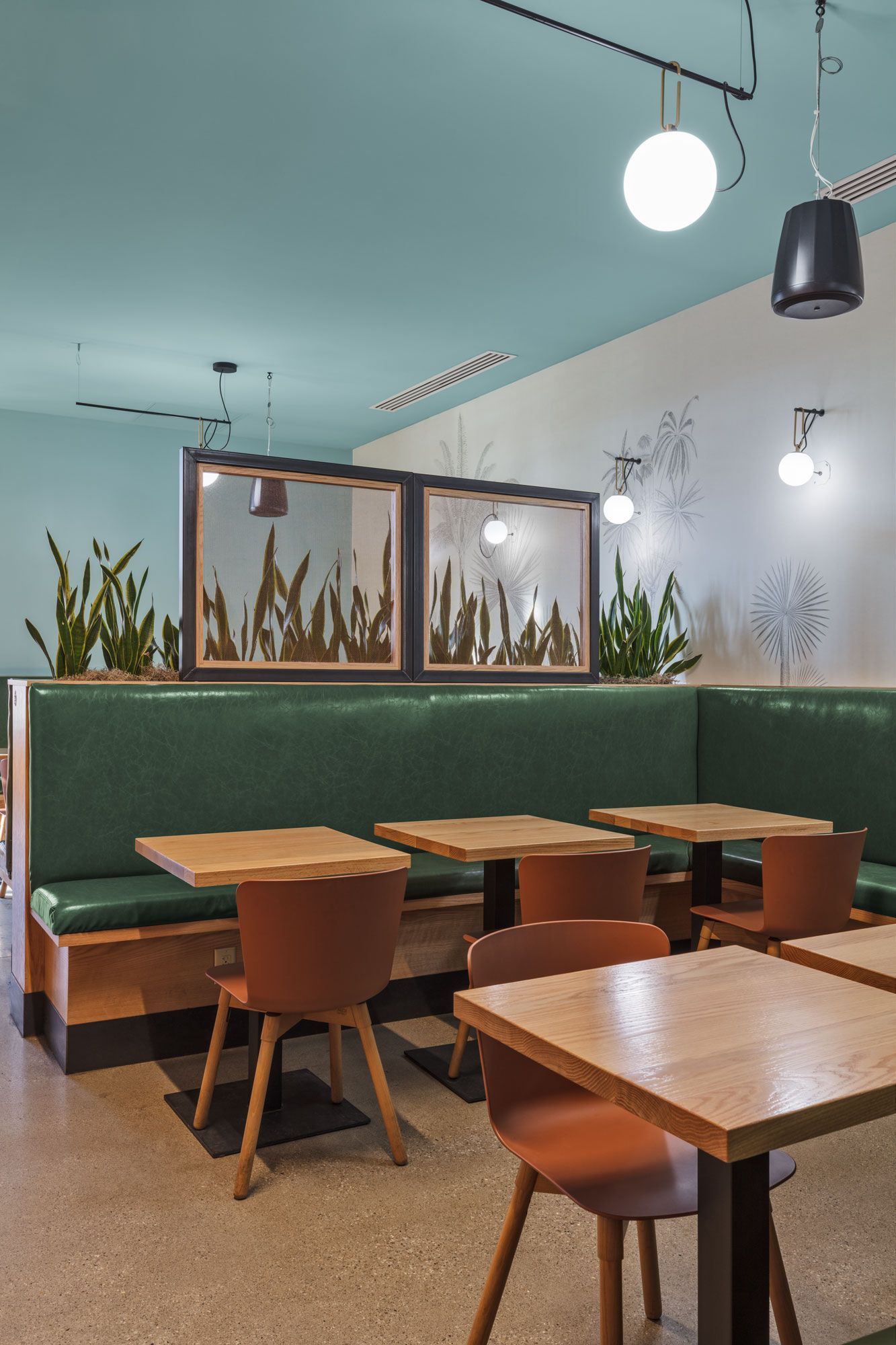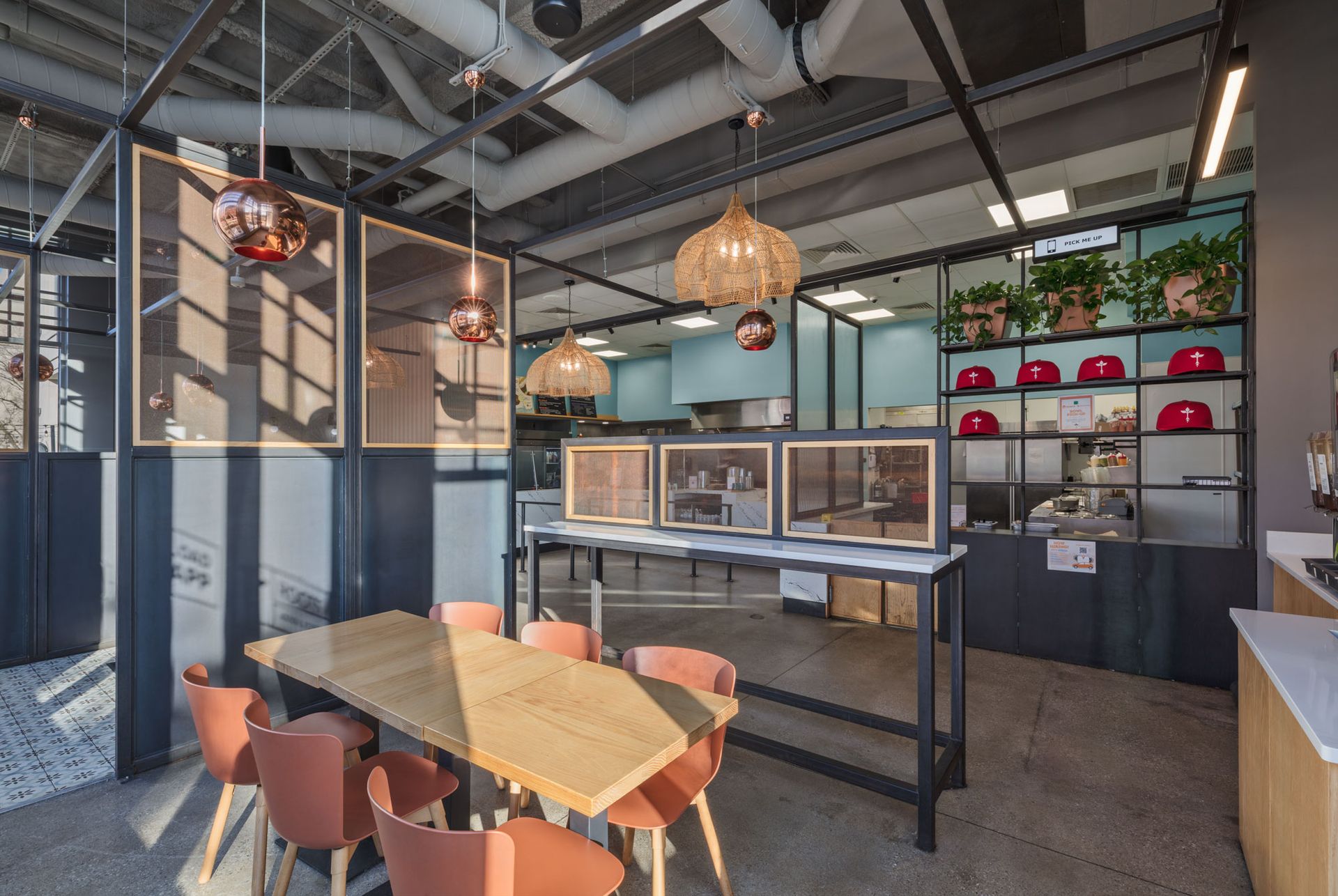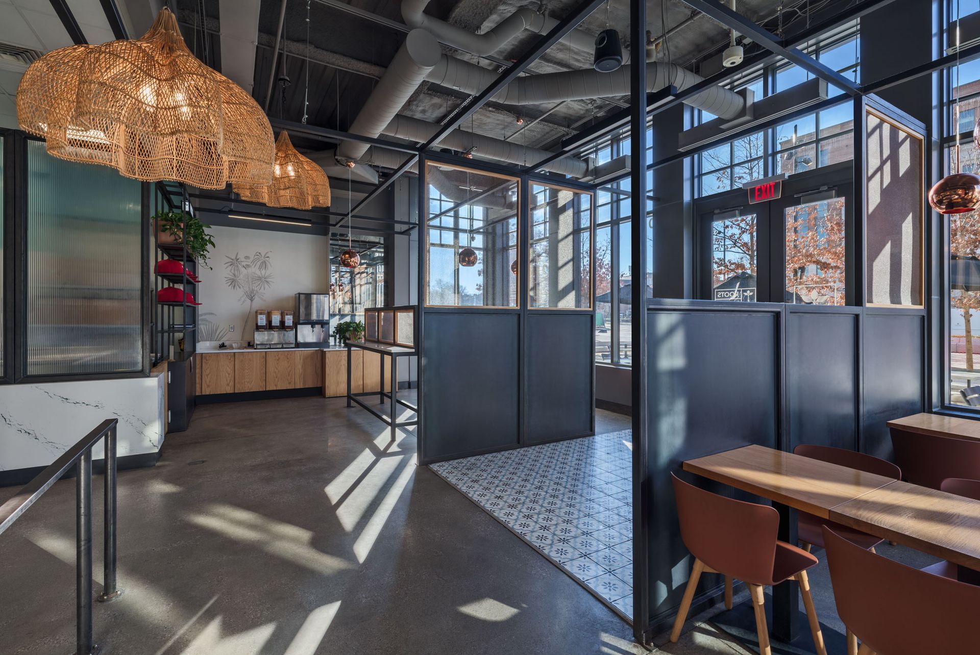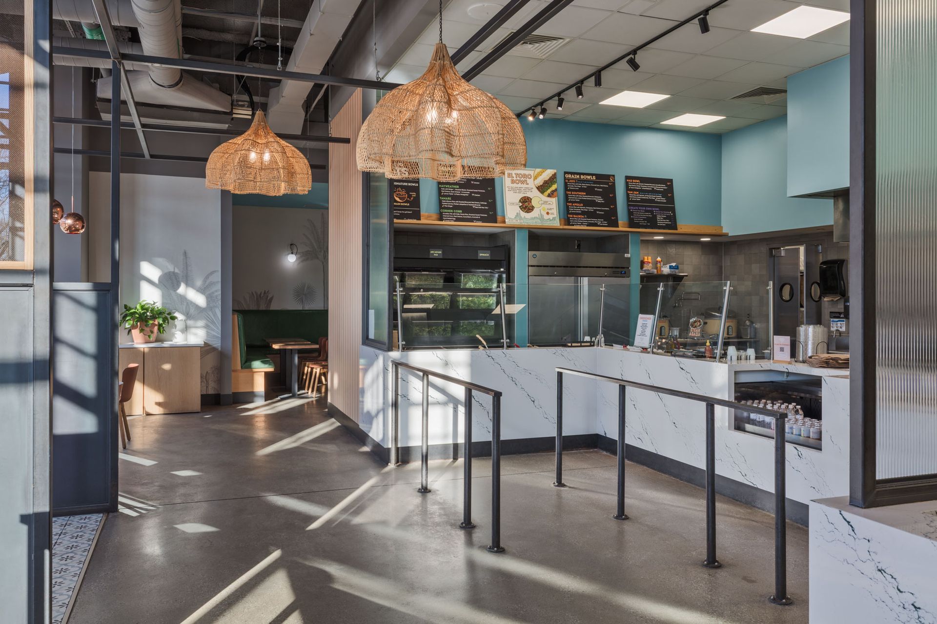 Roots Natural Kitchen interior with wooden tables, brown chairs, woven pendant lights, and floor-to-ceiling windows.