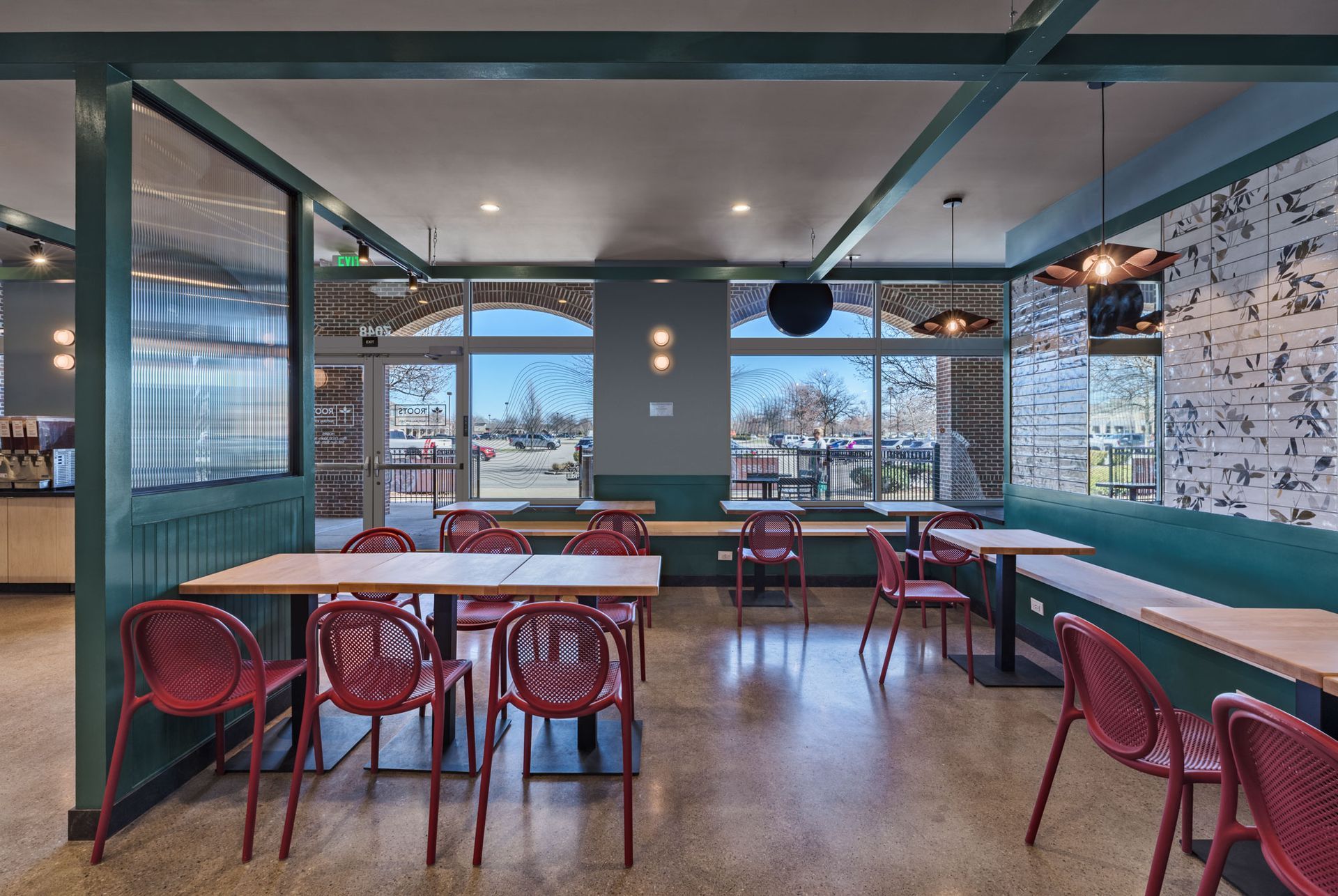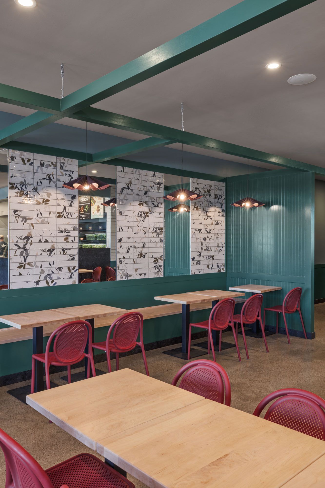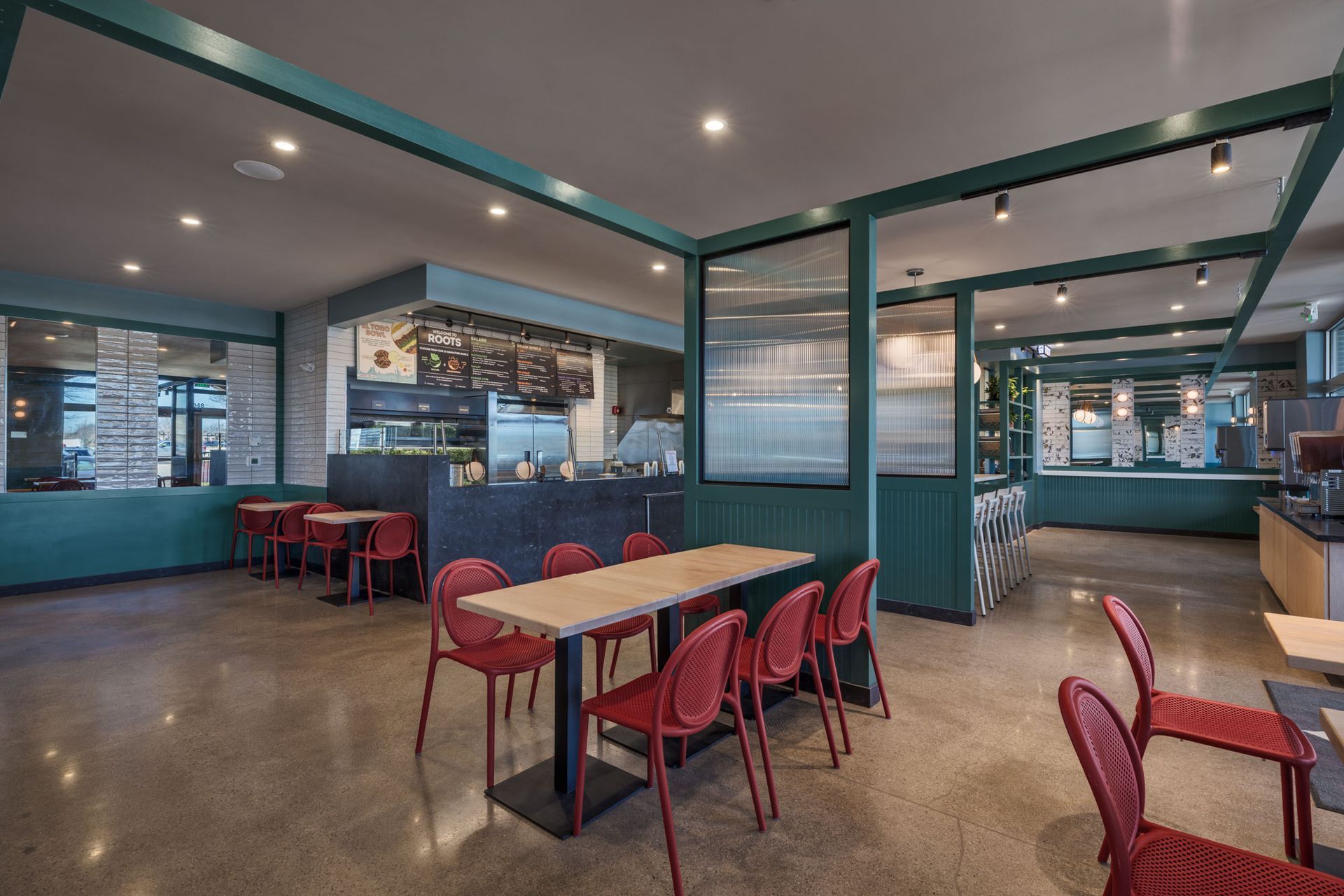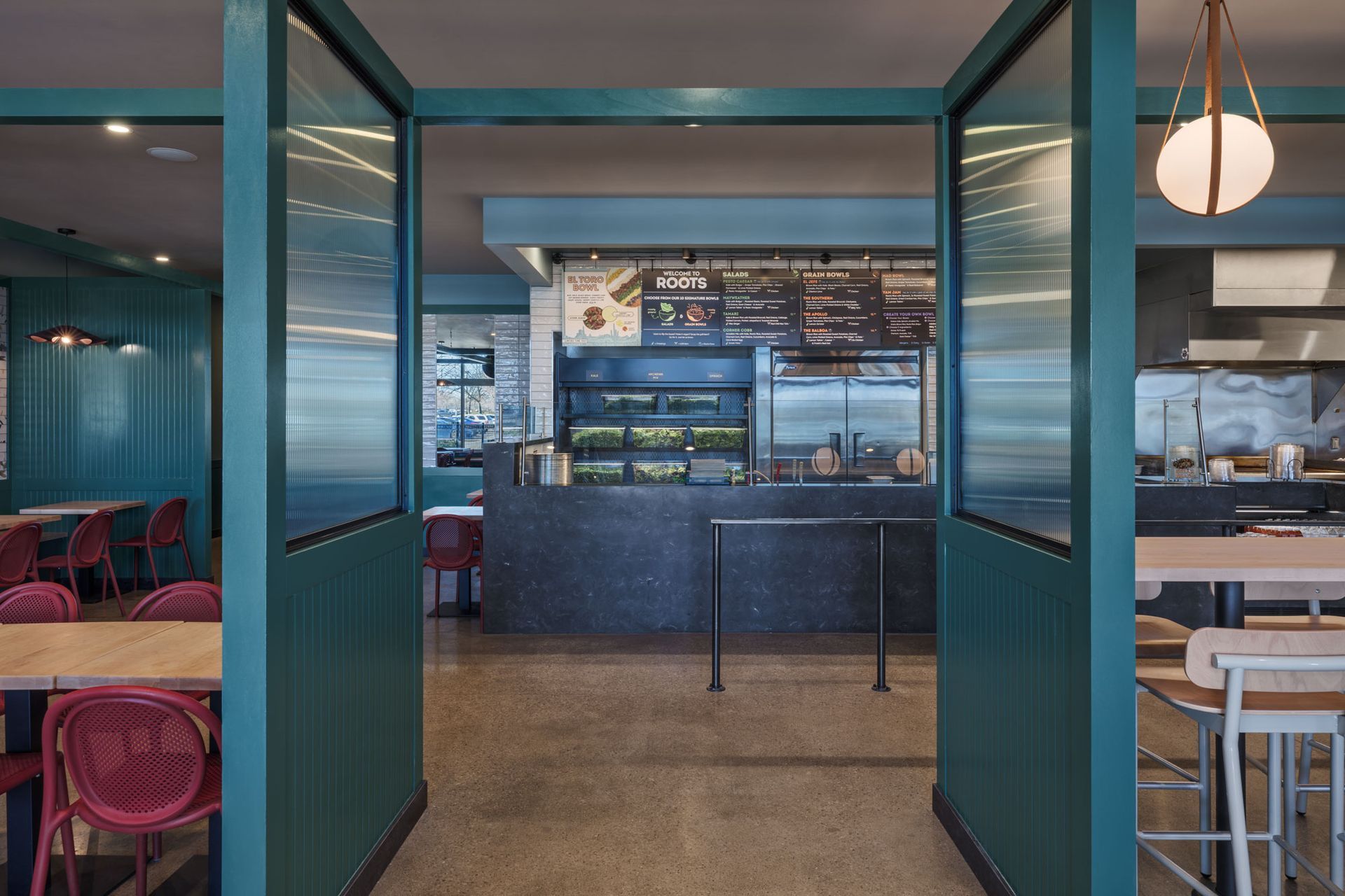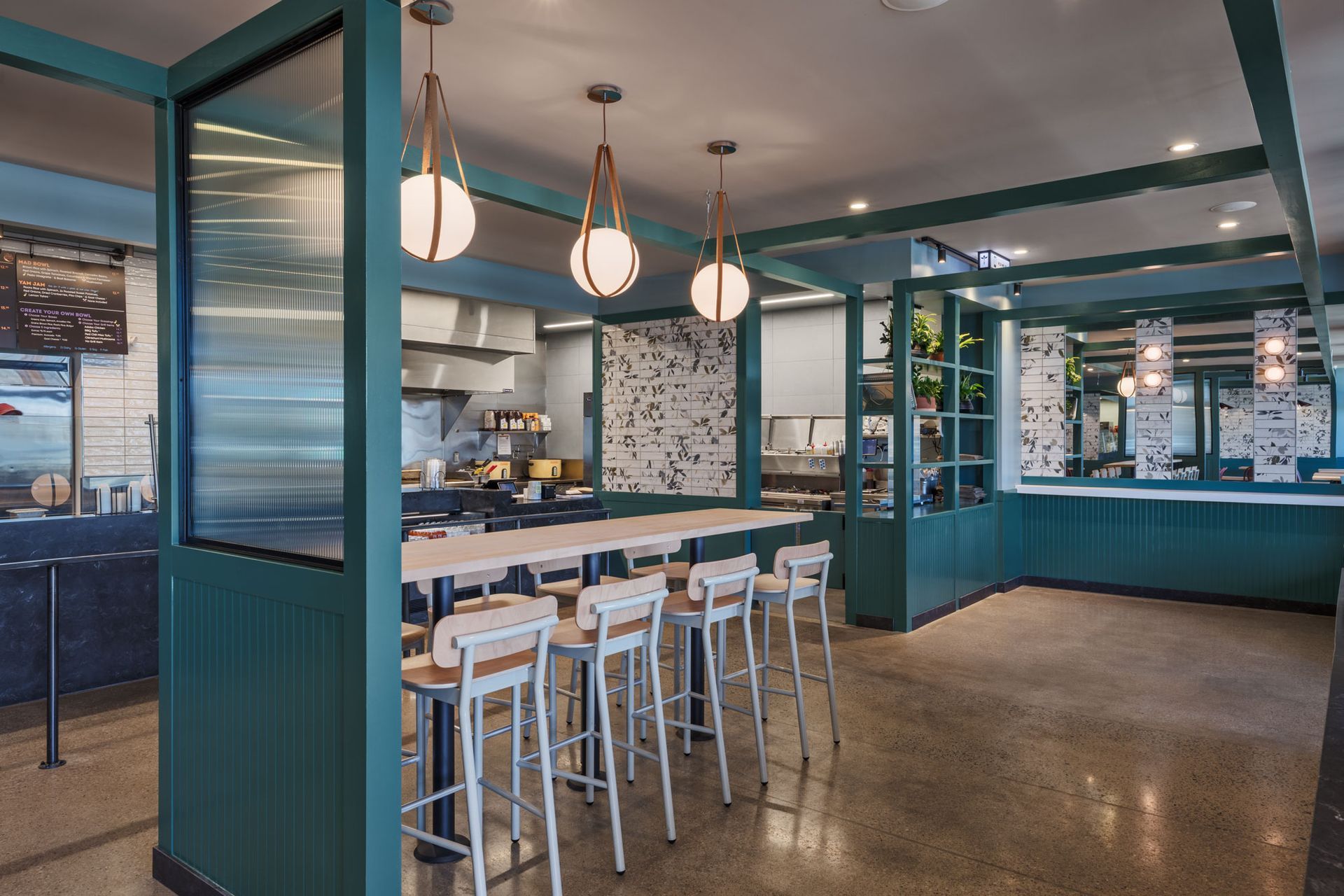 Roots Natural Kitchen interior with teal framework, light wood tables, metal stools, pendant lights, and concrete floors.