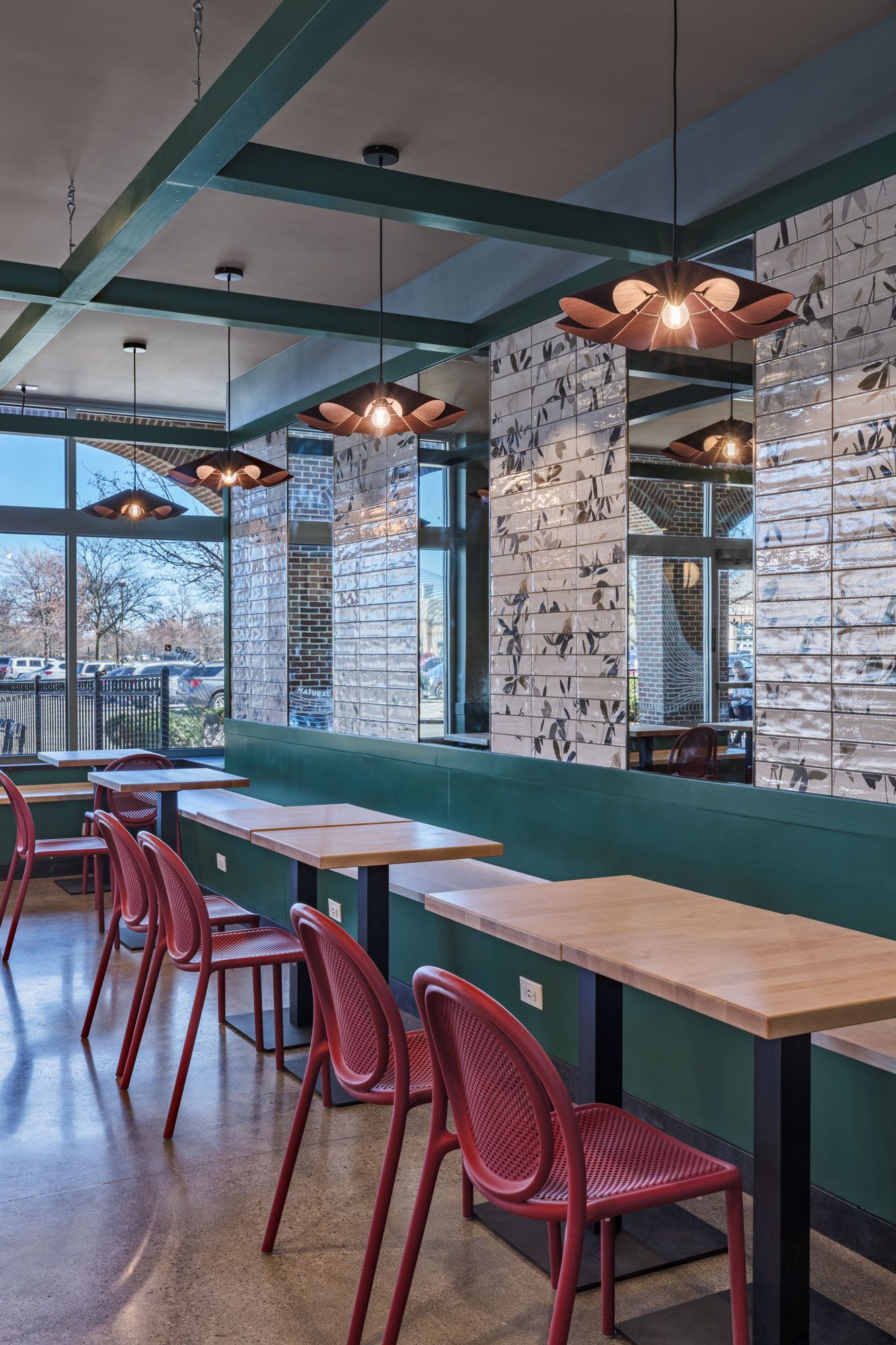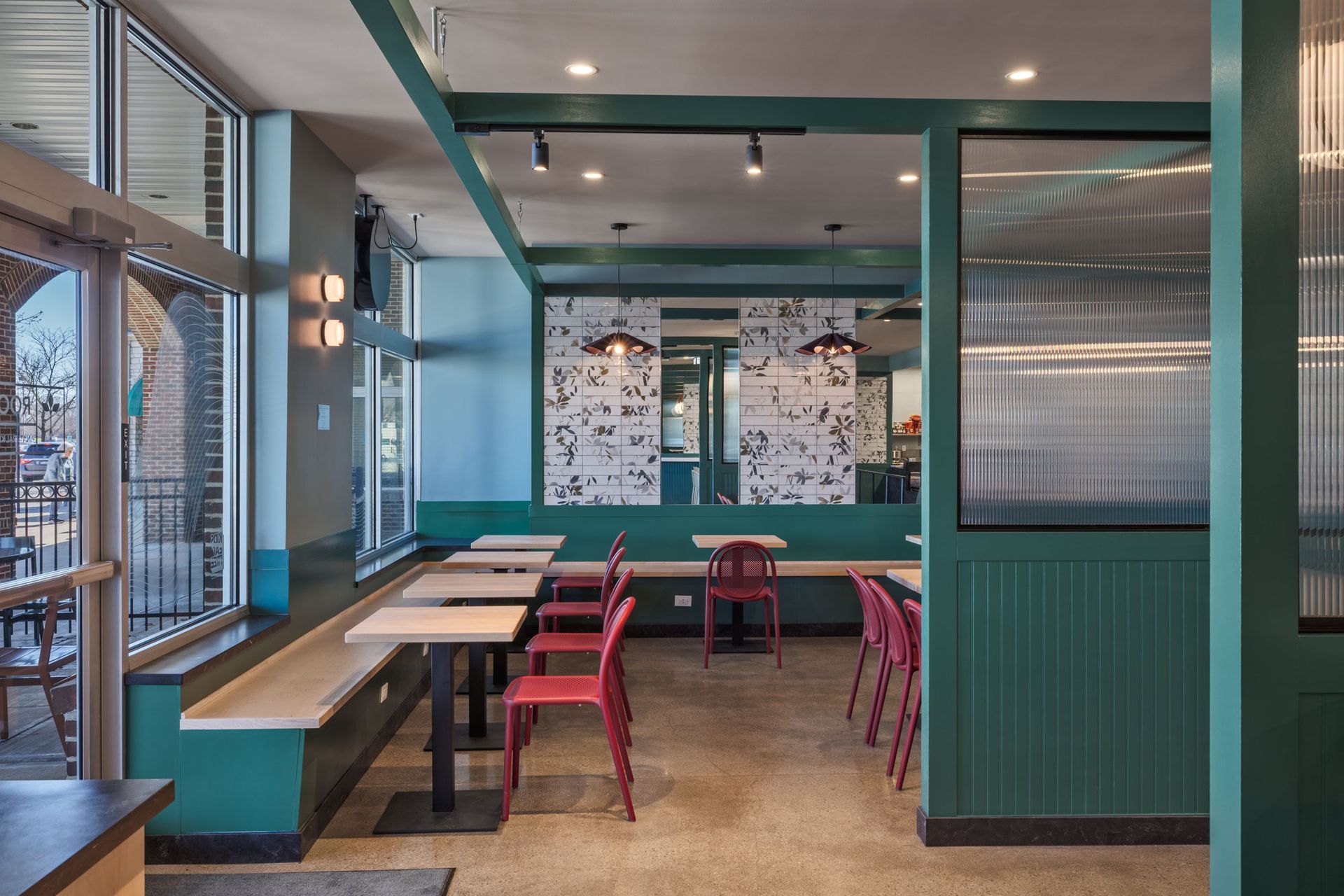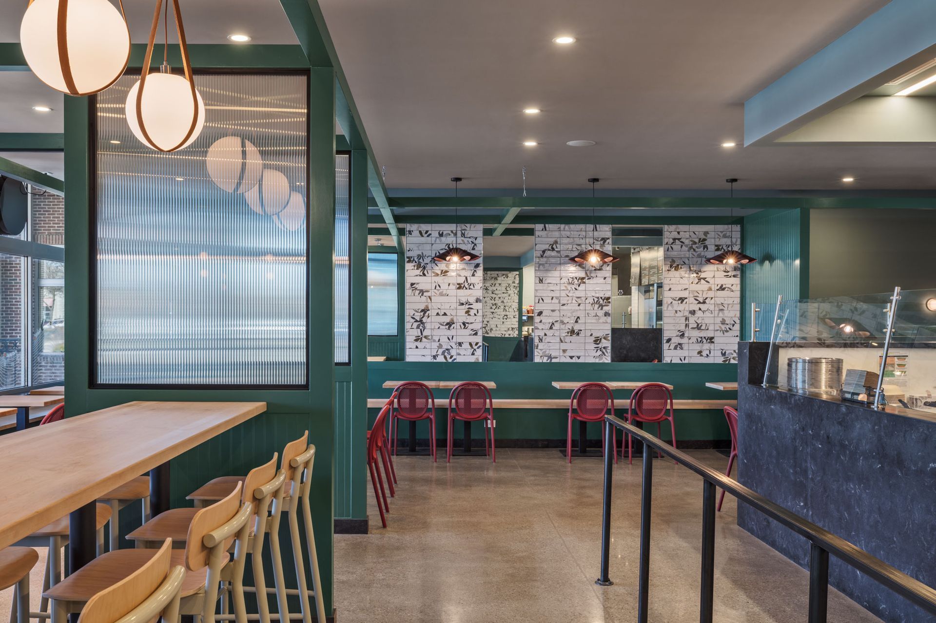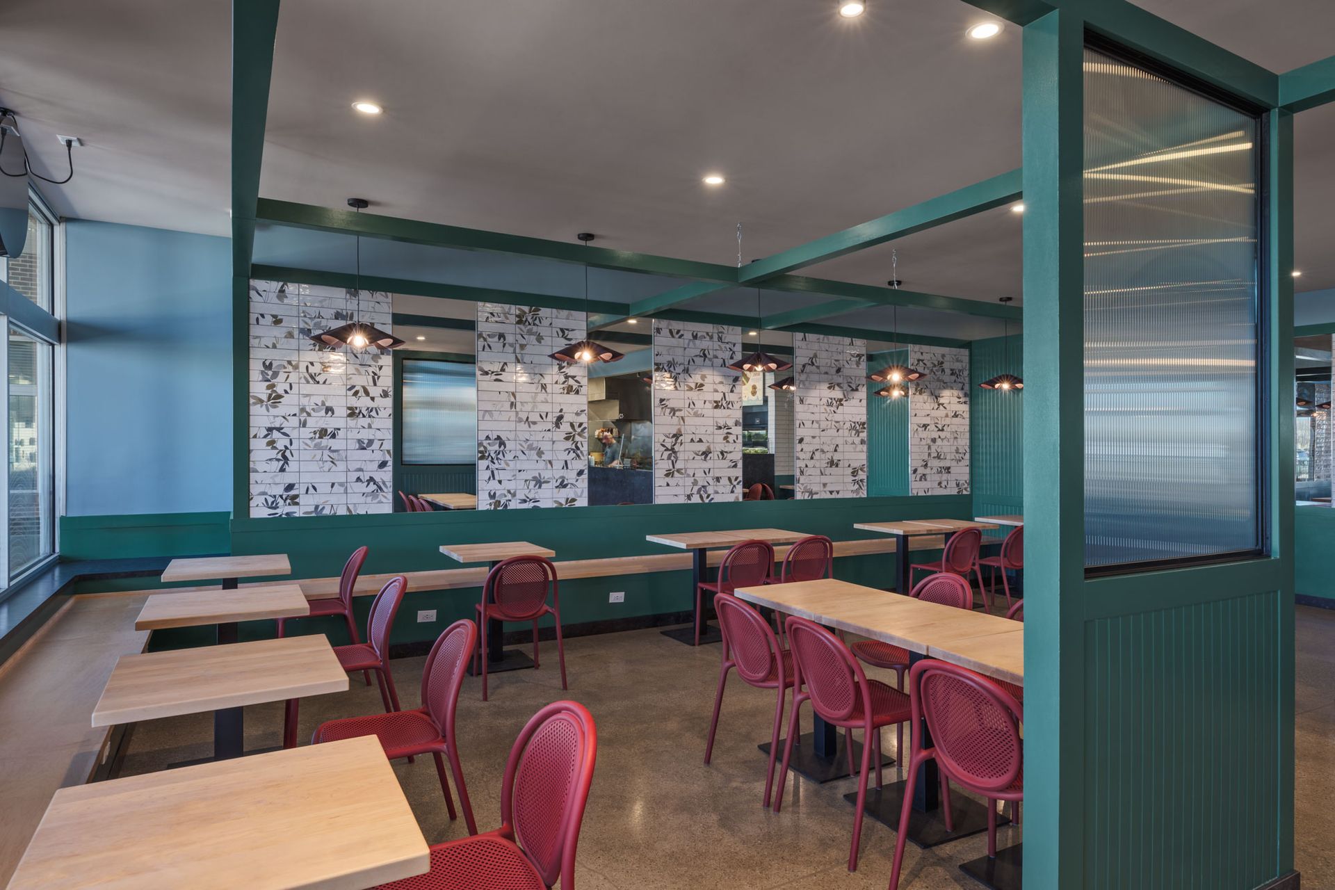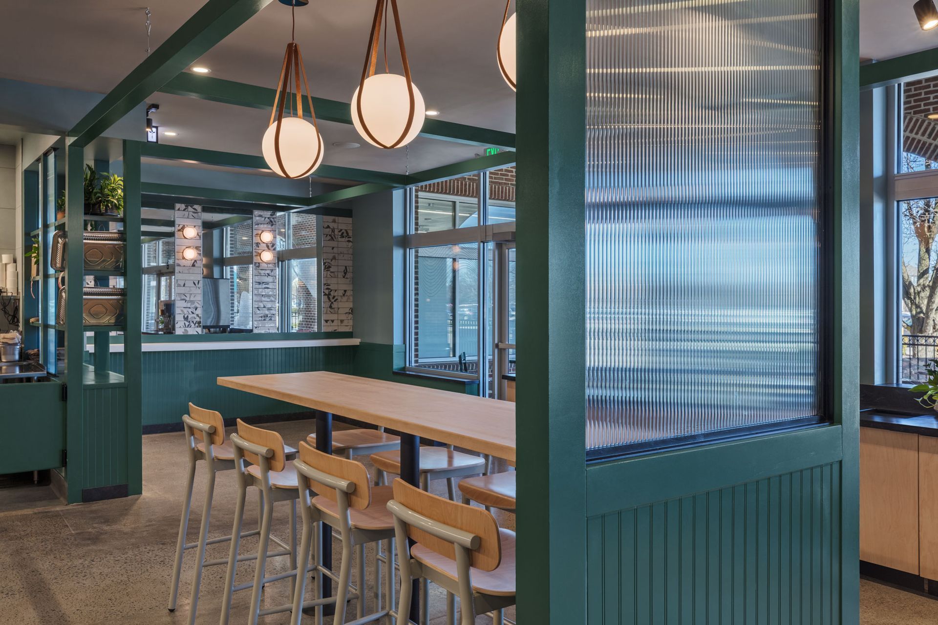 Roots Natural Kitchen interior with teal framework, light wood tables, metal stools, pendant lights, and concrete floors.