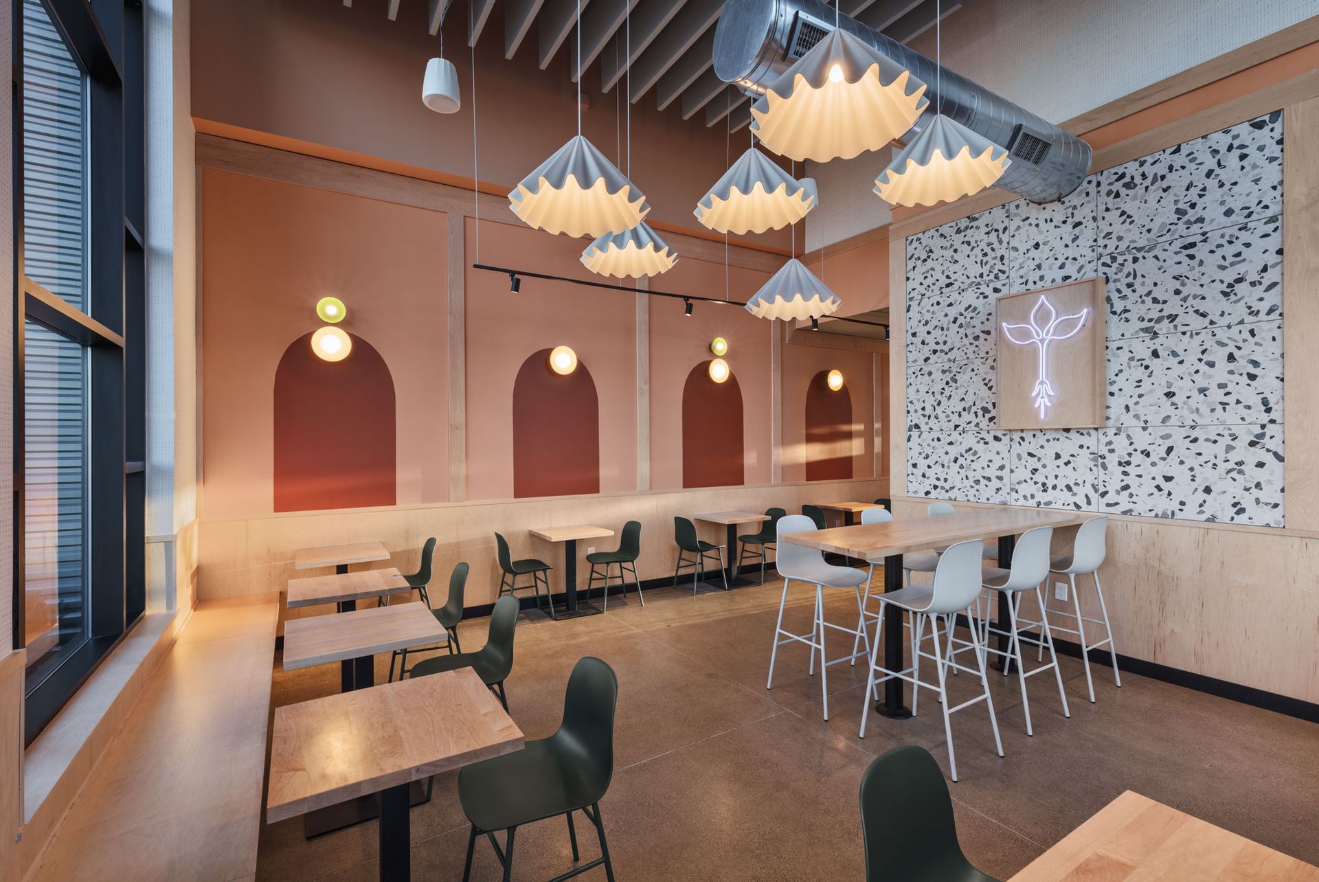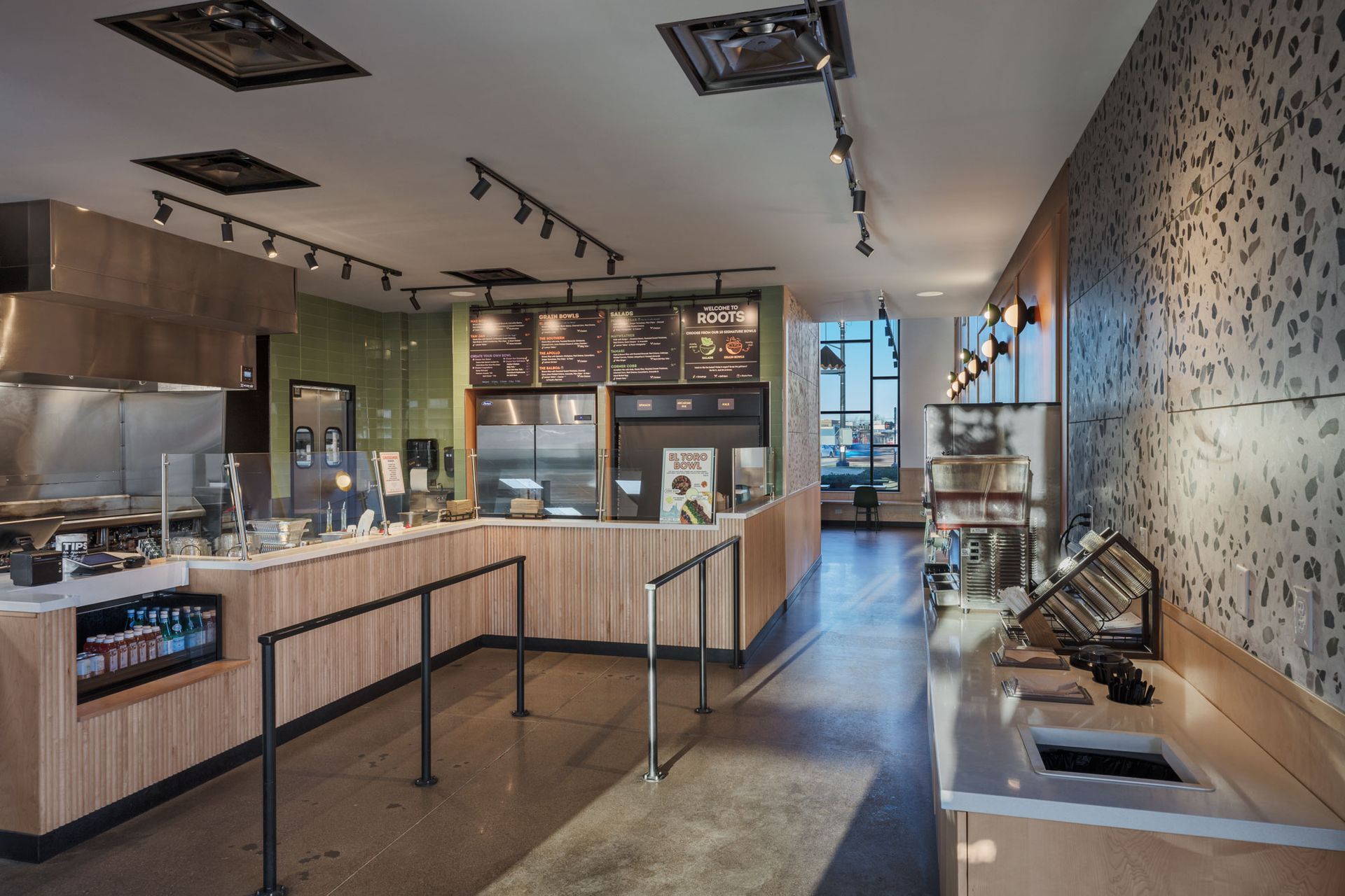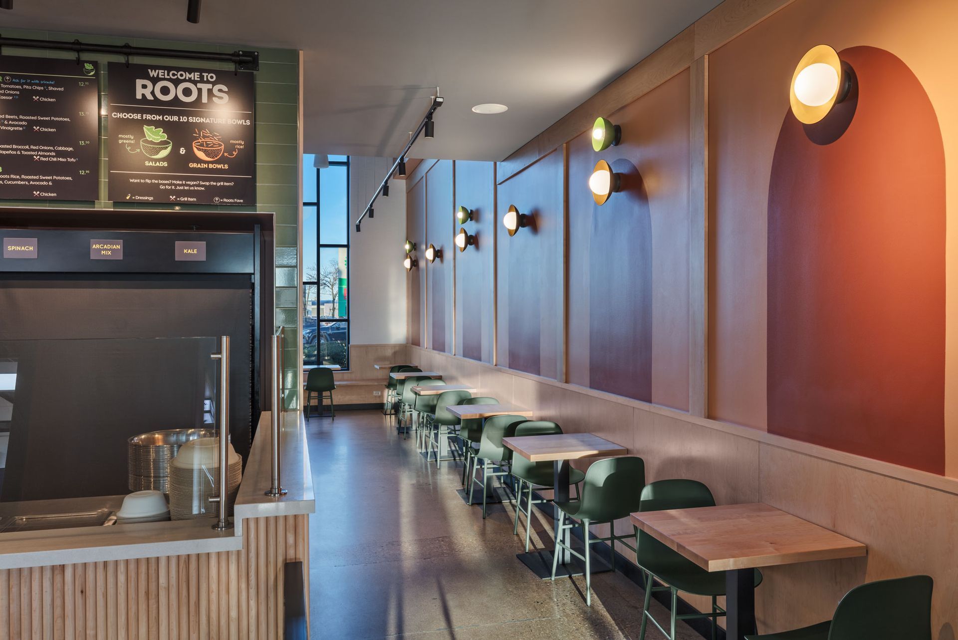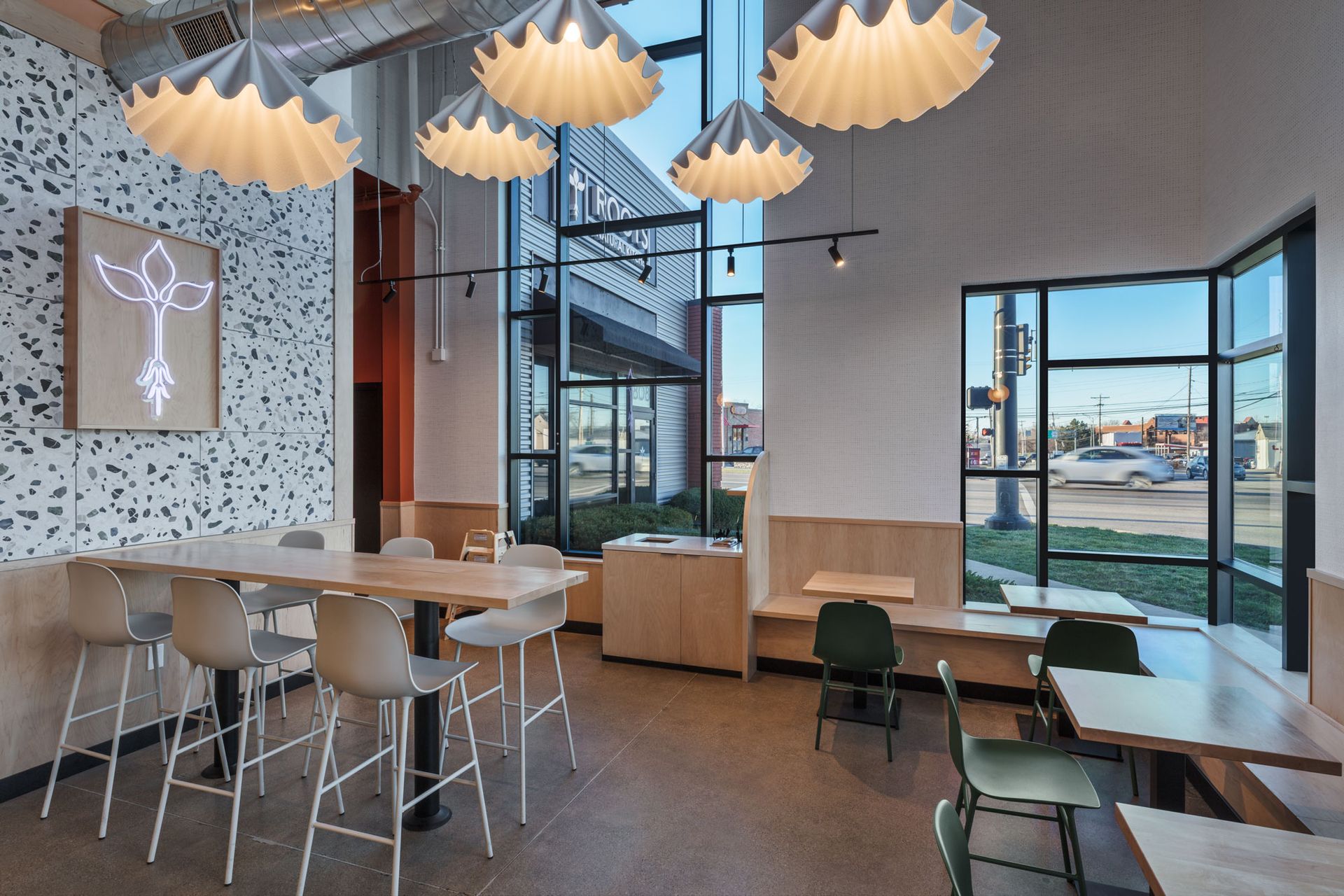 Roots Natural Kitchen interior with floor-to-ceiling windows, high-top tables, bar stools, pendant lighting, and neutral decor.