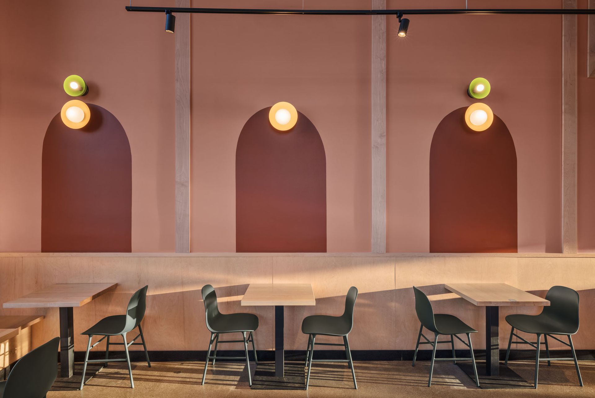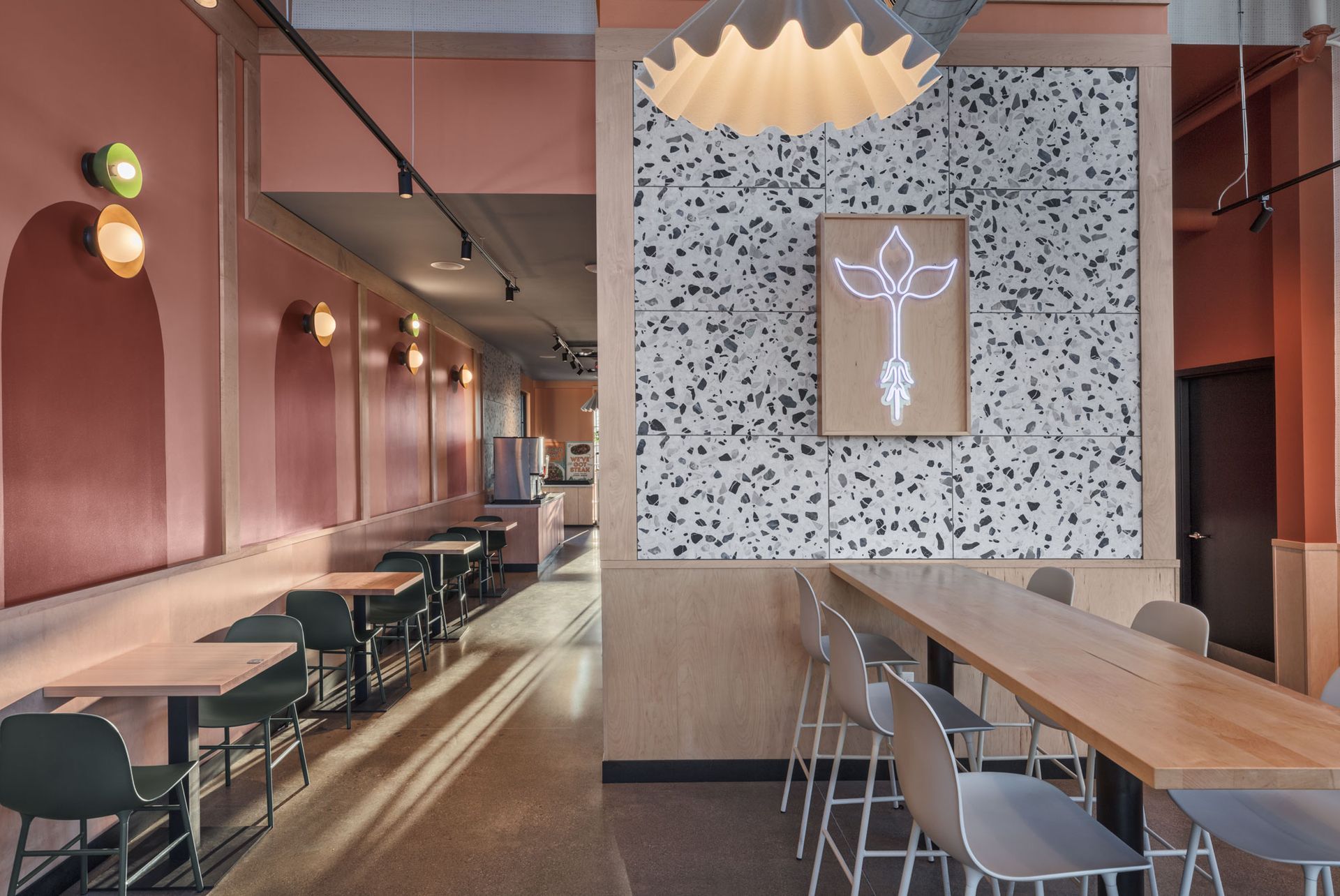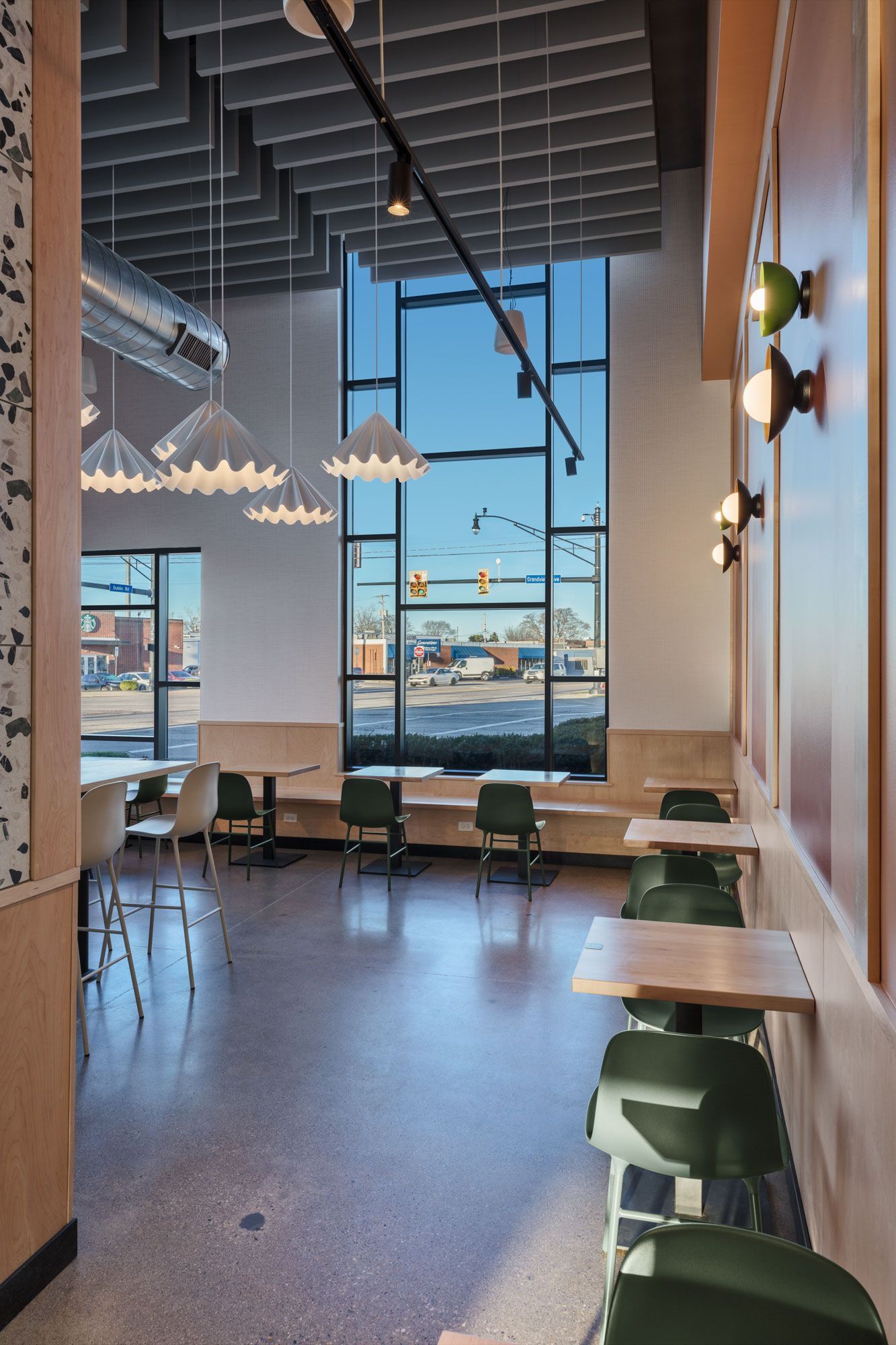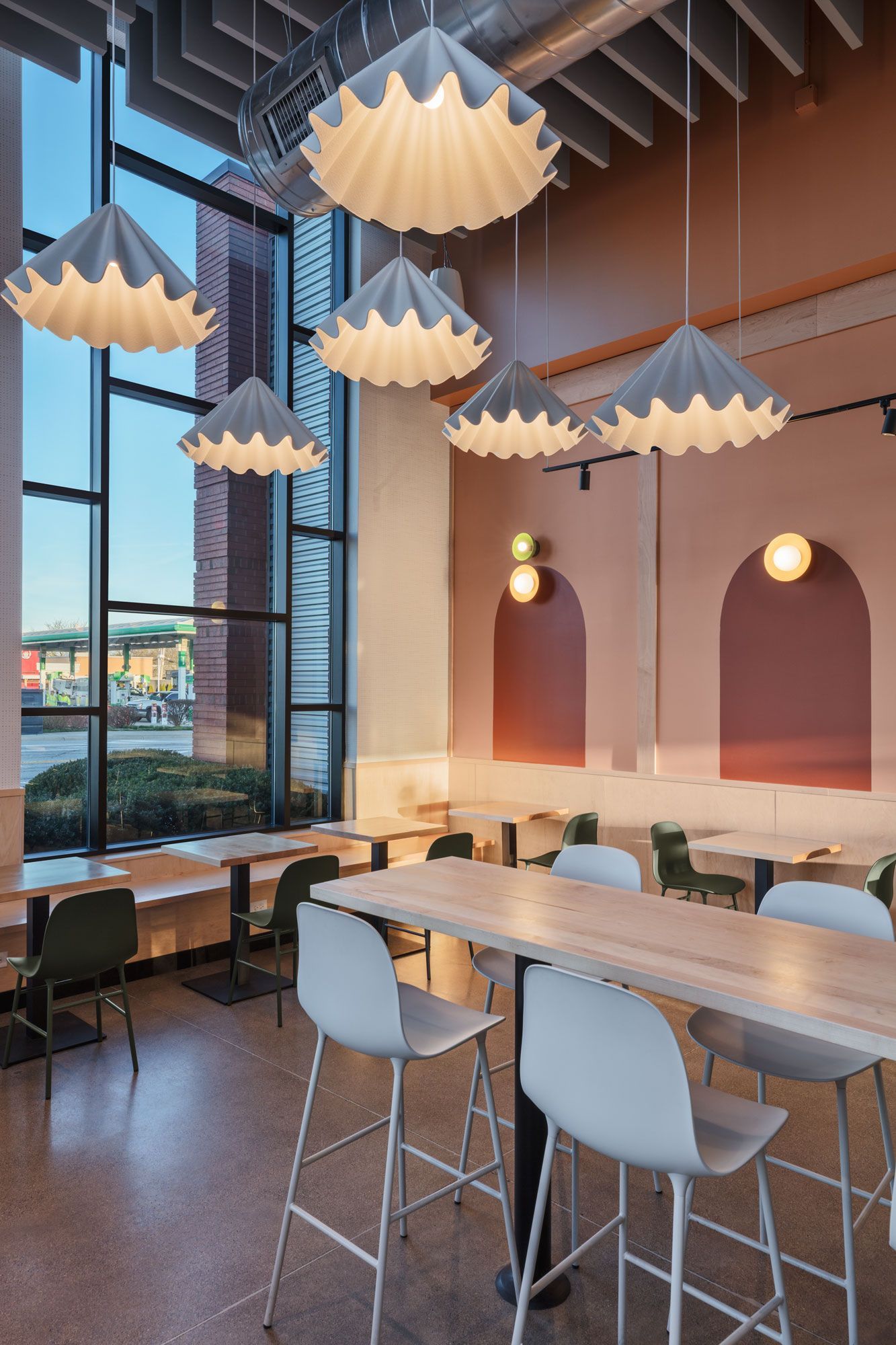 Roots Natural Kitchen interior with floor-to-ceiling windows, high-top tables, bar stools, pendant lighting, and neutral decor.